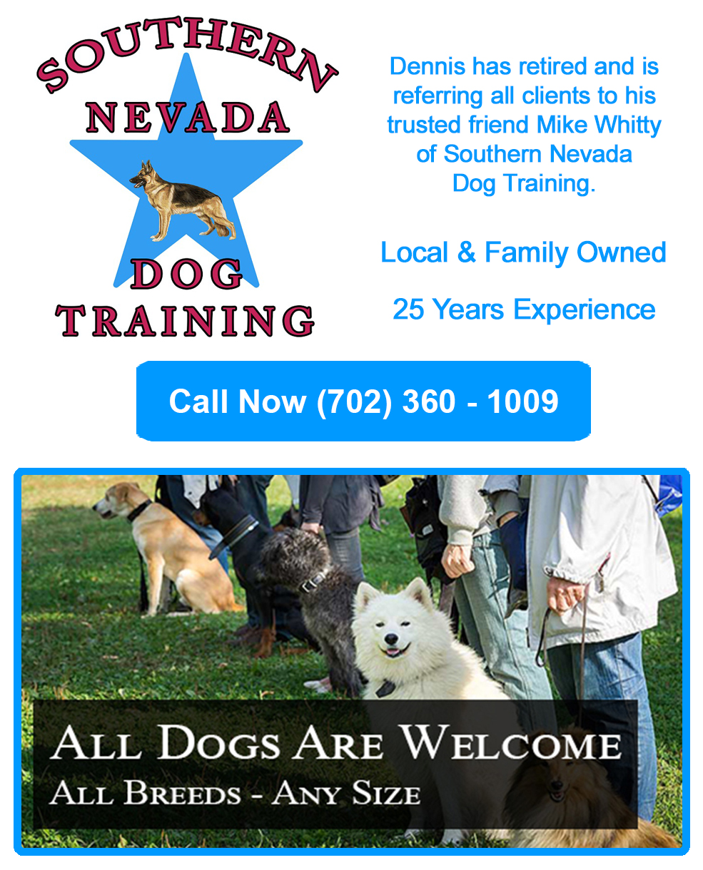 Searching for in home dog training Las Vegas? We are a dog trainer Las Vegas with over 40 years of experience in humane dog training las Vegas. At Home Dog Training is a dog trainer for puppies Las Vegas as well as a trainer for older dogs. For an evaluation appointment with our dog trainer puppy Las Vegas call (702) 602 - 8841 today! | |||||||
